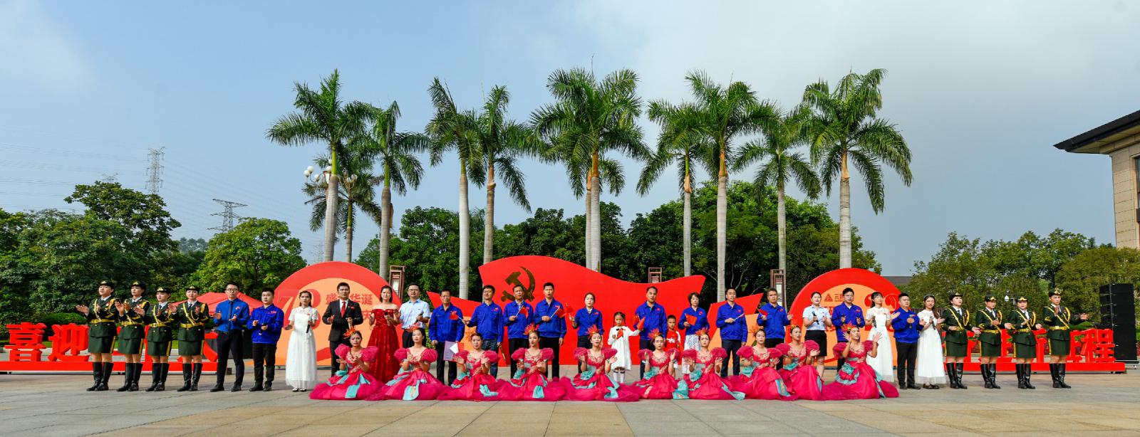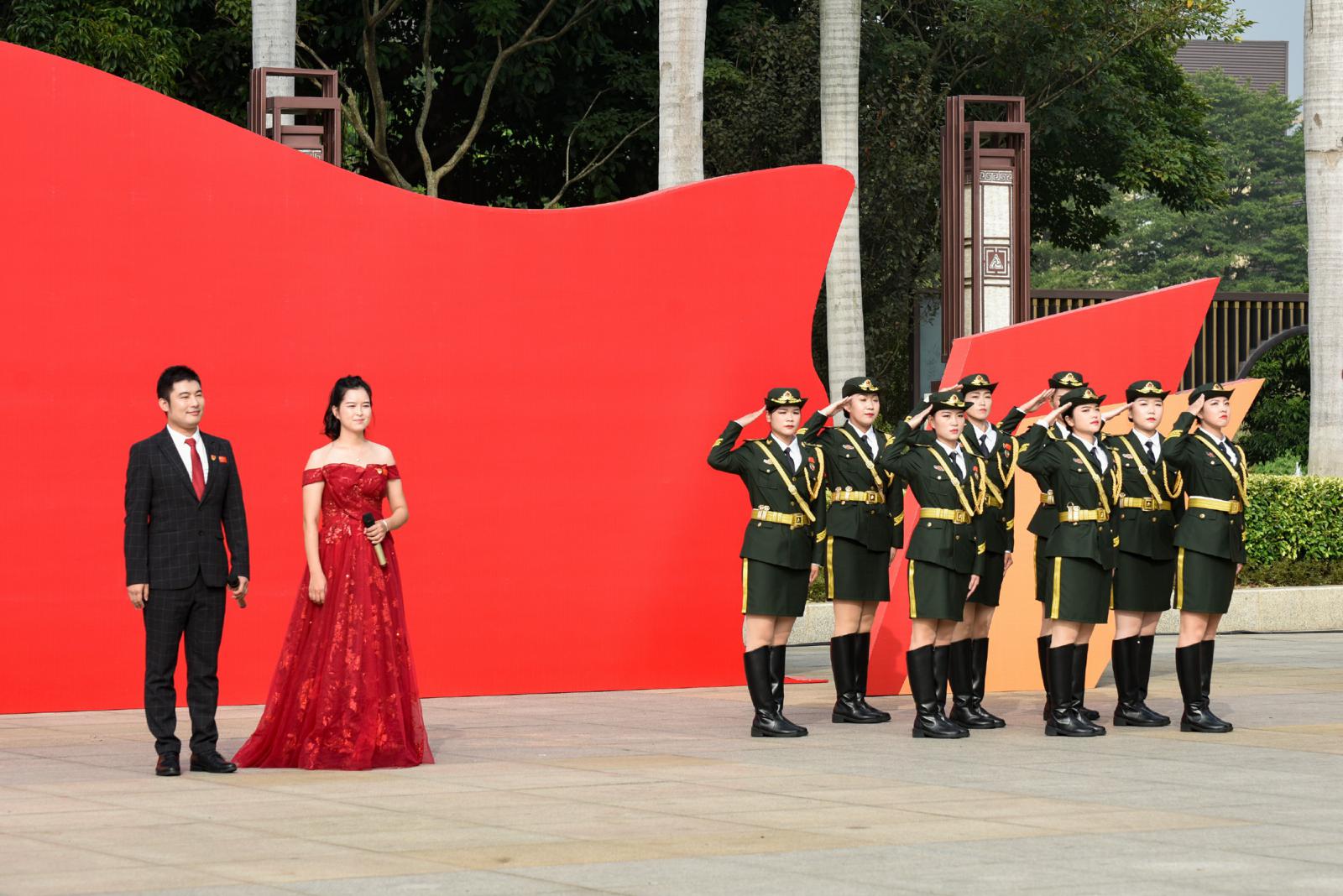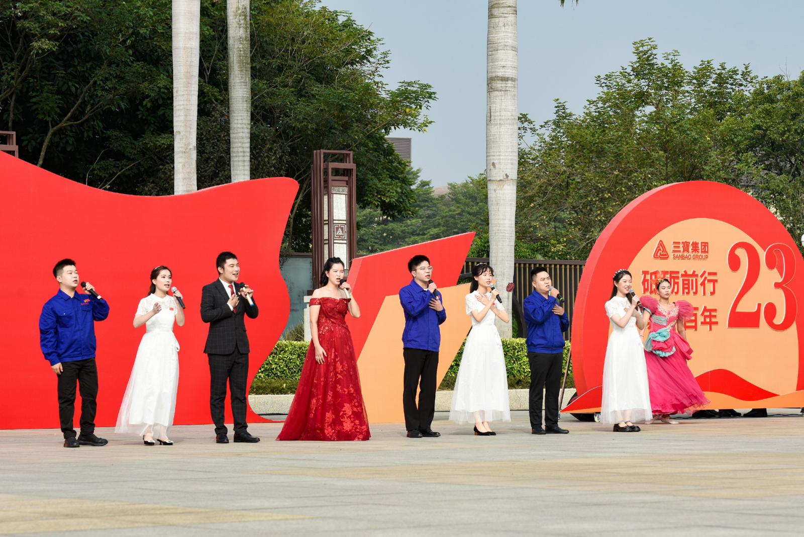升旗儀式后,全體人員手揮小國(guó)旗,觀看《今天是你的生日》、《我愛(ài)你中國(guó)》歌舞表演并齊聲高唱《我和我的祖國(guó)》,送上對(duì)祖國(guó)73周年華誕和三寶成立23周年的美好祝福。