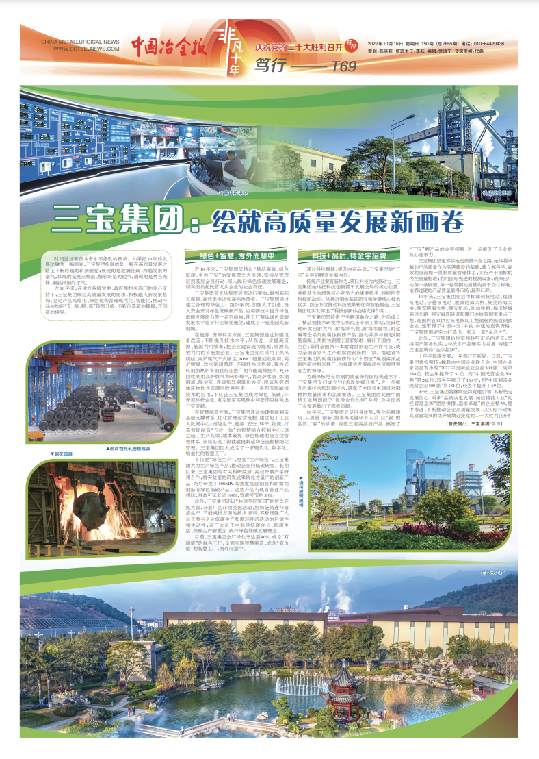 在能源、資源利用方面,三寶集團通過加強設(shè)備改造,不斷提升技術(shù)水平,從而進一步提高資源、能源利用效率,把企業(yè)建設(shè)成為能源、資源高效利用的節(jié)能型企業(yè)。三寶集團先后采用了熱風(fēng)燒結(jié)、高爐煤氣干式除塵、BPRT能量回收利用、高爐噴煤、軟水密閉循環(huán)、連鑄坯熱送熱裝、蓄熱式軋鋼加熱爐等鋼鐵行業(yè)推廣的節(jié)能減排技術(shù),充分回收利用高爐煤氣和轉(zhuǎn)爐煤氣,將高爐水渣、煉鋼鋼渣、除塵灰、連鑄和軋鋼氧化鐵皮、脫硫灰等固體廢物作為資源回收再利用……一系列節(jié)能減排技術(shù)的應(yīng)用,不僅讓三寶集團成為綠色、低碳、環(huán)保型標(biāo)桿企業(yè),更為國家實現(xiàn)碳中和宏偉目標(biāo)做出三寶貢獻。